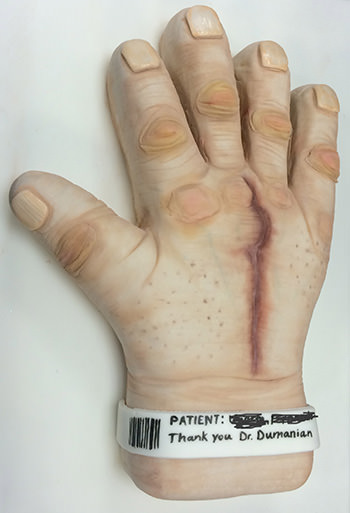 Gift from a thankful hand surgery patient. Delicious chocolate cake, but it was difficult for me to cut into the fingers!I am experiencing some recovery in my peroneal nerve and knew that it would delight you to see what I can do. Beginning last July, I noticed the slightest movement in my toes. Progress has been slow and steady in the 8 months since then and now I am walking (mostly indoors, but also light yard work and excursions such as yesterday) without my AFO and without stumbling. I have a lot of movement in my middle three toes–none yet in the big toe or the small toe, the latter still looking “droopy”. However, the PT at the hospital where I work out has measured my foot with a dynamometer and watched me progress from 0-0-0 in January to 4-4-5 currently. I continue to exercise several times a week at our hospital’s Life Fit program. I had been walking 2 miles at 3.2 with my AFO. This week I experimented without the AFO. I am limiting myself to 1 mile at the same rate and it has gone fine. I notice some very slight swelling between my lower calf and ankle, but am not particularly concerned about that.