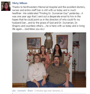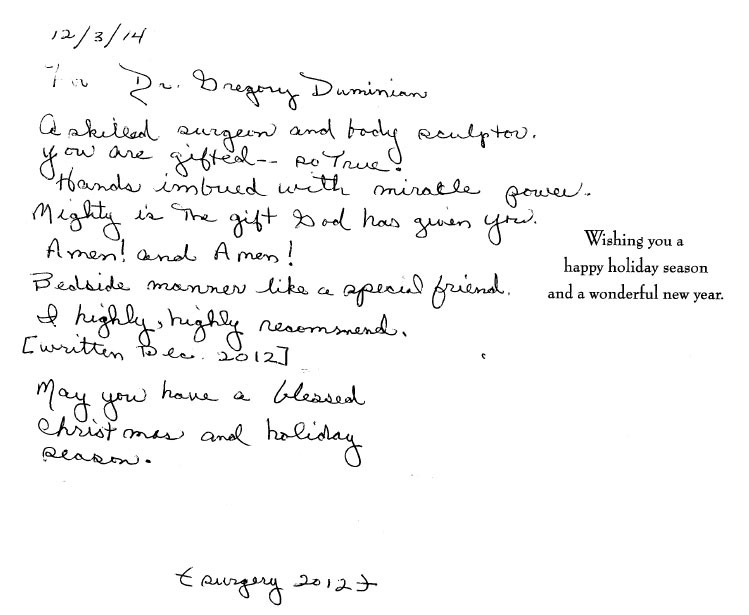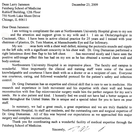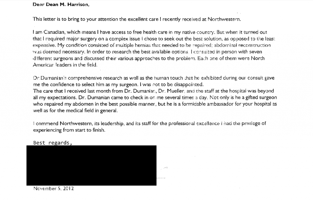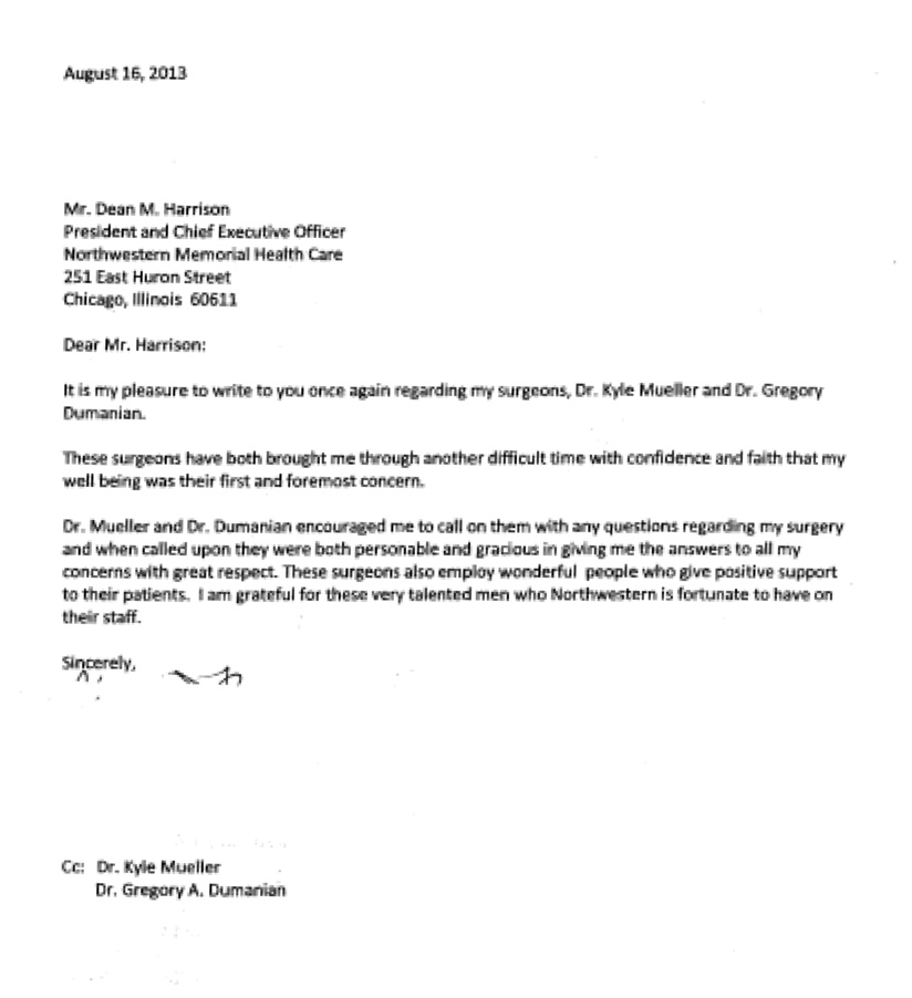 Thank you for improving the quality of my life and giving me my independence. I had two abdominal hernias for 2 years as a result of surgery and treatment for cancer. My oncologist referred me to you for surgery once I was well enough. Other doctors at NU confirmed you were the best in repairing hernias such as mine. I had spent the last two years constantly pushing in my hernia in many disparate and embarassing circumstances, needing someone to be with me in case I was not able to push it in myself. I had to go the E.R. once because it was so extended and I was in so much pain I could not manage it. I read on cancer blogs of other women with hernias like mine. Many of them needed multiple hernia repairs because of repeated tears. You told me that you had an over 95% success rate, two years following surgery. In Dec. 2012 my surgery went perfect, hernias repaired. The pain meds were well planned and I did not experience pain. I had no complications. I was able to go to theater and leave my home within 2 weeks of the surgery, one week after discharge. I was off pain meds and walking in my house for 30 minutes by the third week. By the fourth week I was at the gym doing low impact aerobics.I am independent again and not worried about being in pain from the hernia. I appreciate being independent and free of pain because of you, your team at the Cosmetic Surgery clinic and in the in-patient unit of the hospital. I owe my life and the quality of my living to the professionals at Northwestern Hospital.